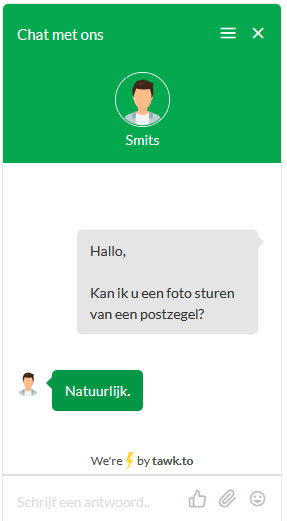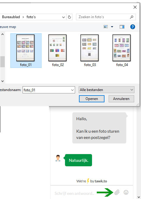 Één of twee foto’s verstuurt u het makkelijkst via de chat functie op onze website. Hieronder laten wij zien hoe u eenvoudig bestanden verstuurt via de chat-app.