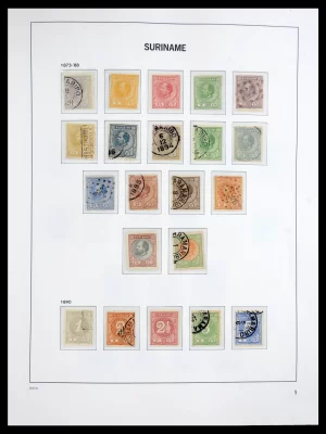 €1.100,00Op no. 32a na, complete, gestempelde postzegelverzameling Suriname 1873-1975, inclusief luchtpost en portzegels in luxe Kabe album met cassette.