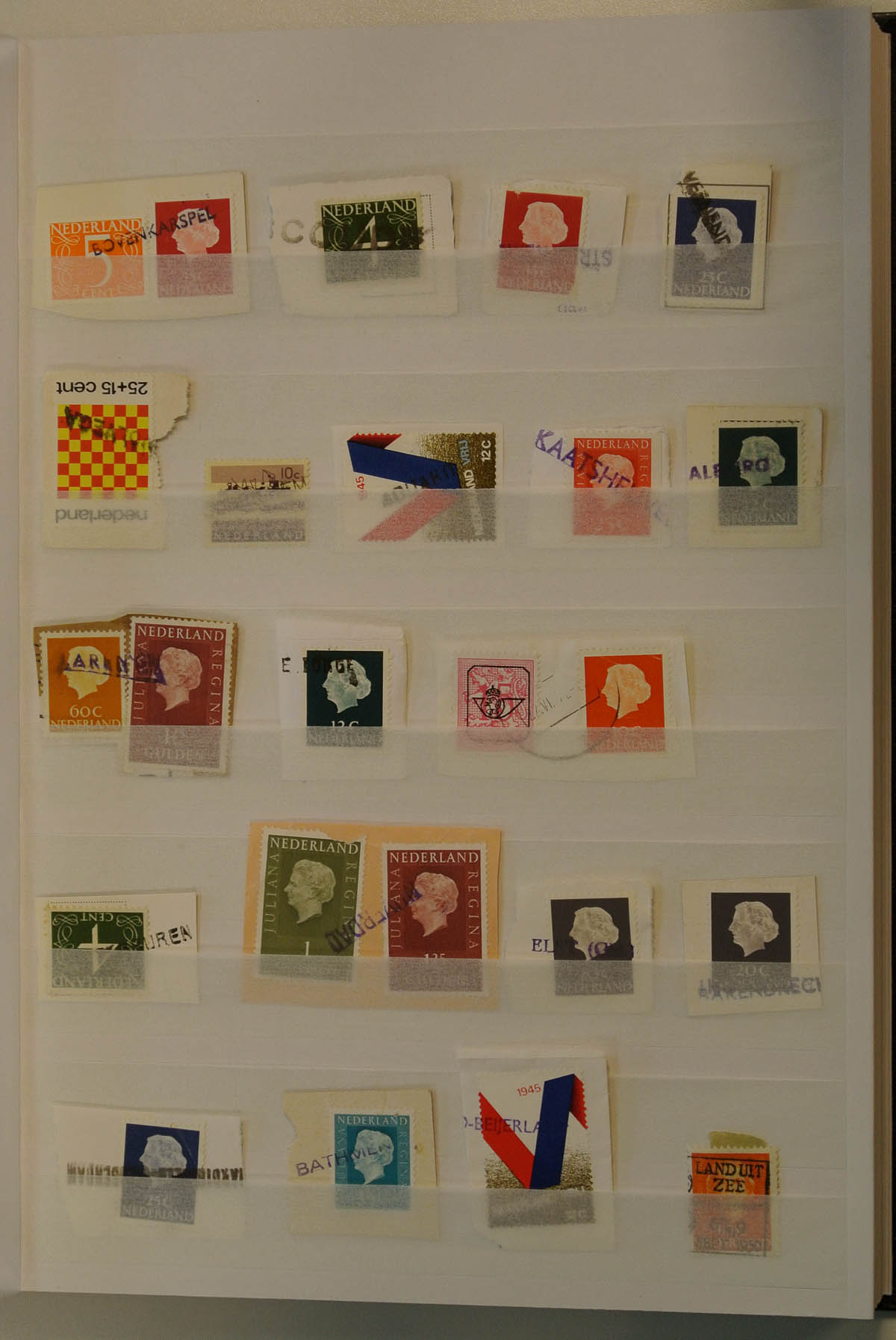 Insteekboek met ca. 600 langstempels van Nederland, voornamelijk op briefstukjes, waaronder ook nieuwjaarstempels. Veel emissie 1953 en 1971.