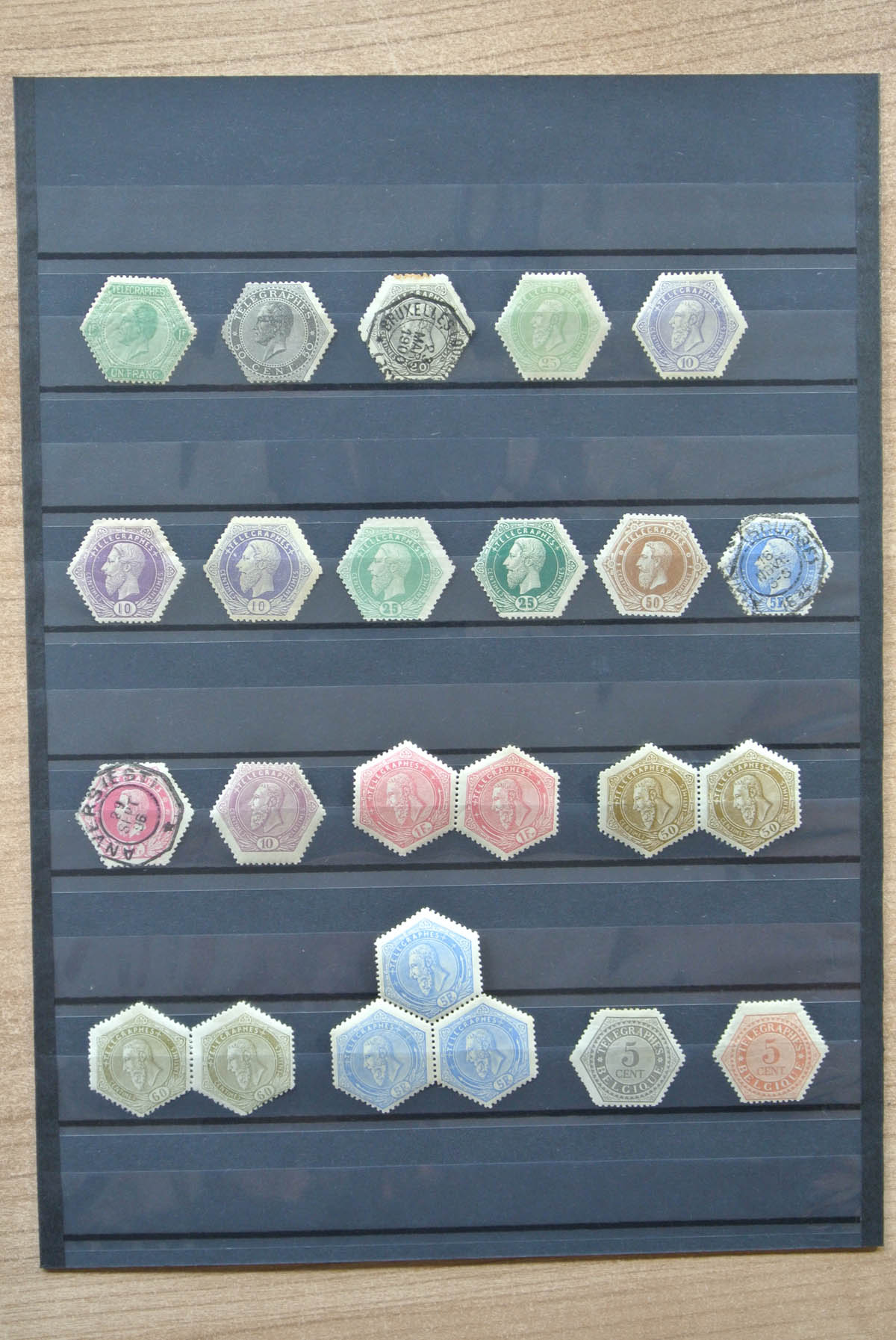 Stockblad met 24 ongebruikte en gebruikte telegramzegels van België. Tevens 8 ongebruikte telefoonzegels.
