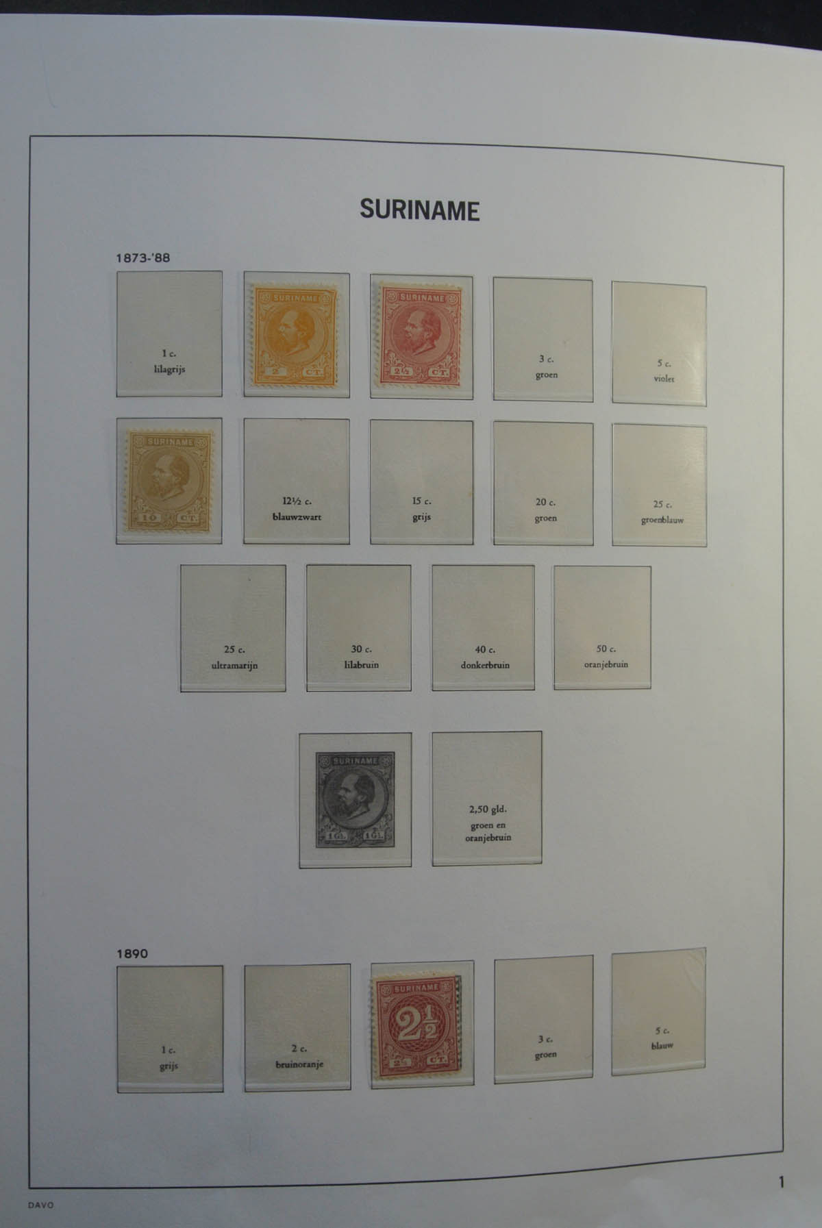 Goed gevulde, postfrisse en ongebruikte collectie Suriname 1873-1975 in Davo luxe album. Collectie bevat aardig materiaal zoals (NVPH no’s): 23*, 65-68(*), 100-103*, 118-126*, 130-136**, 137-140*, 141-144*, 146-149*, 151-156*, 157-178*, 197-199*, 257-273**, 280-283*, 294**, 308*, luchtpost 1-7*, 19* (paar bruine vlekjes), port 17-32*, 33-35*, etc. Koopje!