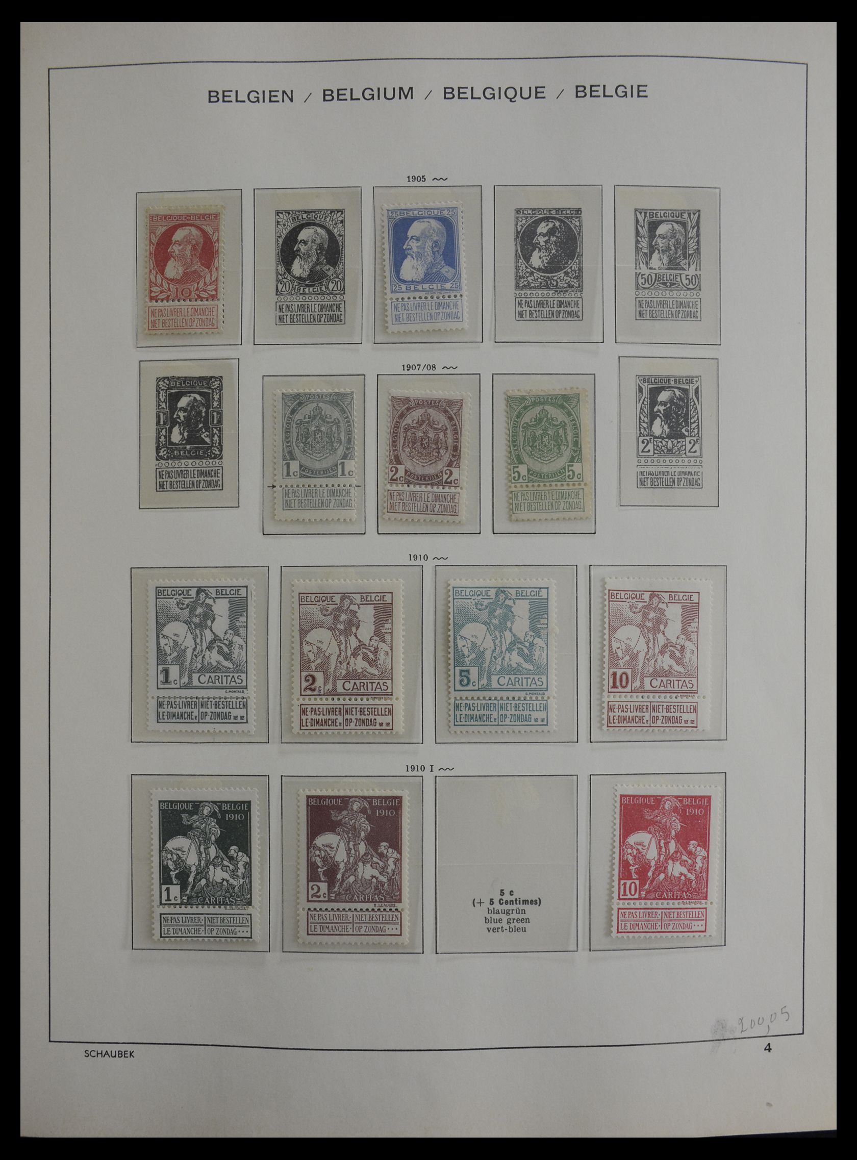 Goed gevulde, voornamelijk postfrisse en ongebruikte collectie België 1905-2002 in 5 Schaubek albums. Collectie bevat o.a. (Michel no’s): 89-99*, 141*, 156*, 157*, 158*, 191-203*, 216*, 217* (2x), 235-243**, 244-249*, 262*, 263*, 313**, 506-513**, 828*, 829**, 867-871*, 902-903** triptiek, 906-908**, 941-946*, 947-948*, 961-966*, 967-972*, 989-991*, 992-994*, 995-1000*, blok 1*, 4*, 5*, 6*, 23*, 25, spoorwegzegels 126*, 136-155* (147 ontbreekt), 157-170*, 171-190*, 225-248**, 293**, 294**, 325-343**, 345**, 356**, 357-378**, 383-384**, dagbladzegels 15*, 38*, 39*, 41*, etc.