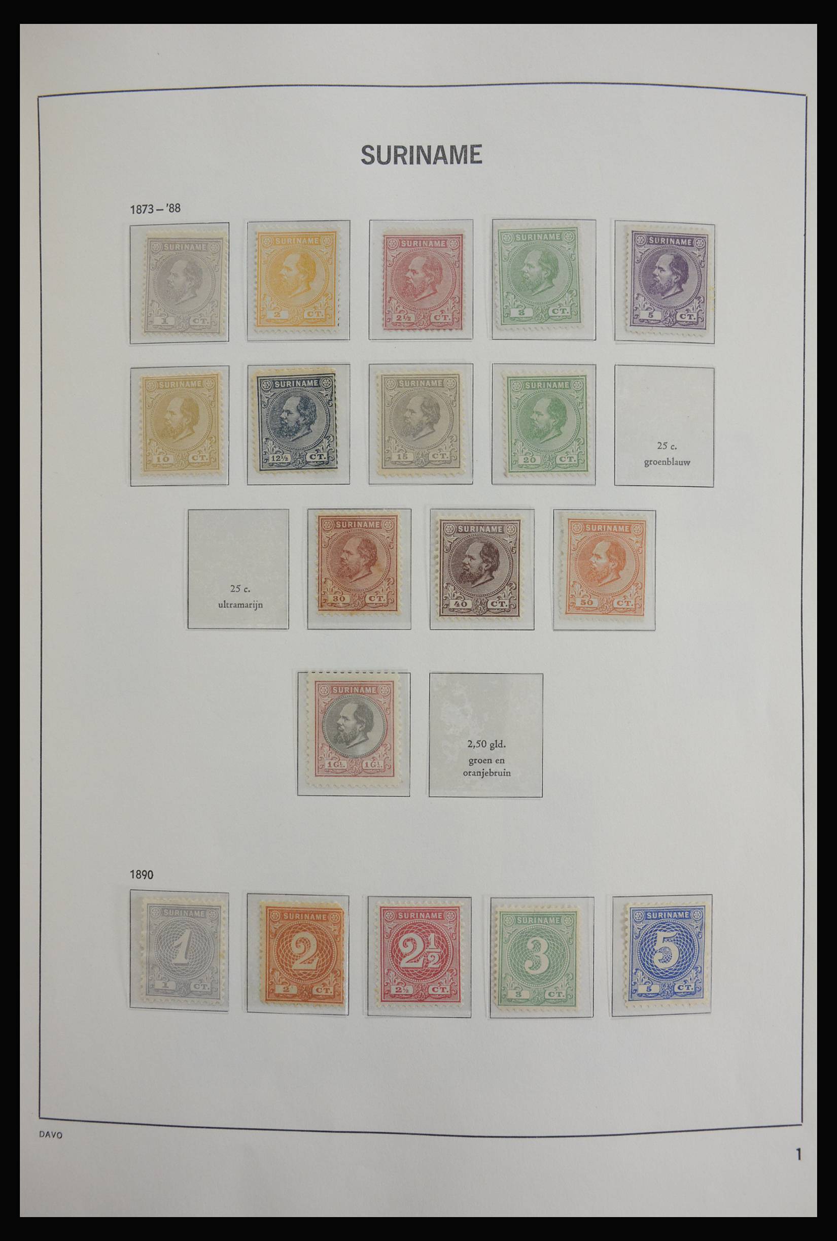 Zeer goed gevulde, voornamelijk ongebruikte collectie Suriname 1873-1980 in Davo cristal album. Collectie bevat o.a. (NVPH no’s): 1-14(*) (no. 10 en 10a ontbreken), 16-20(*), 34-36(*), 37-40(*), 41-57(*), 69-103*, 104-110*, 115**, 118-126*, 130-136*, 157-178*, 220-243*, 280-283*, etc. Hoge cat. waarde!