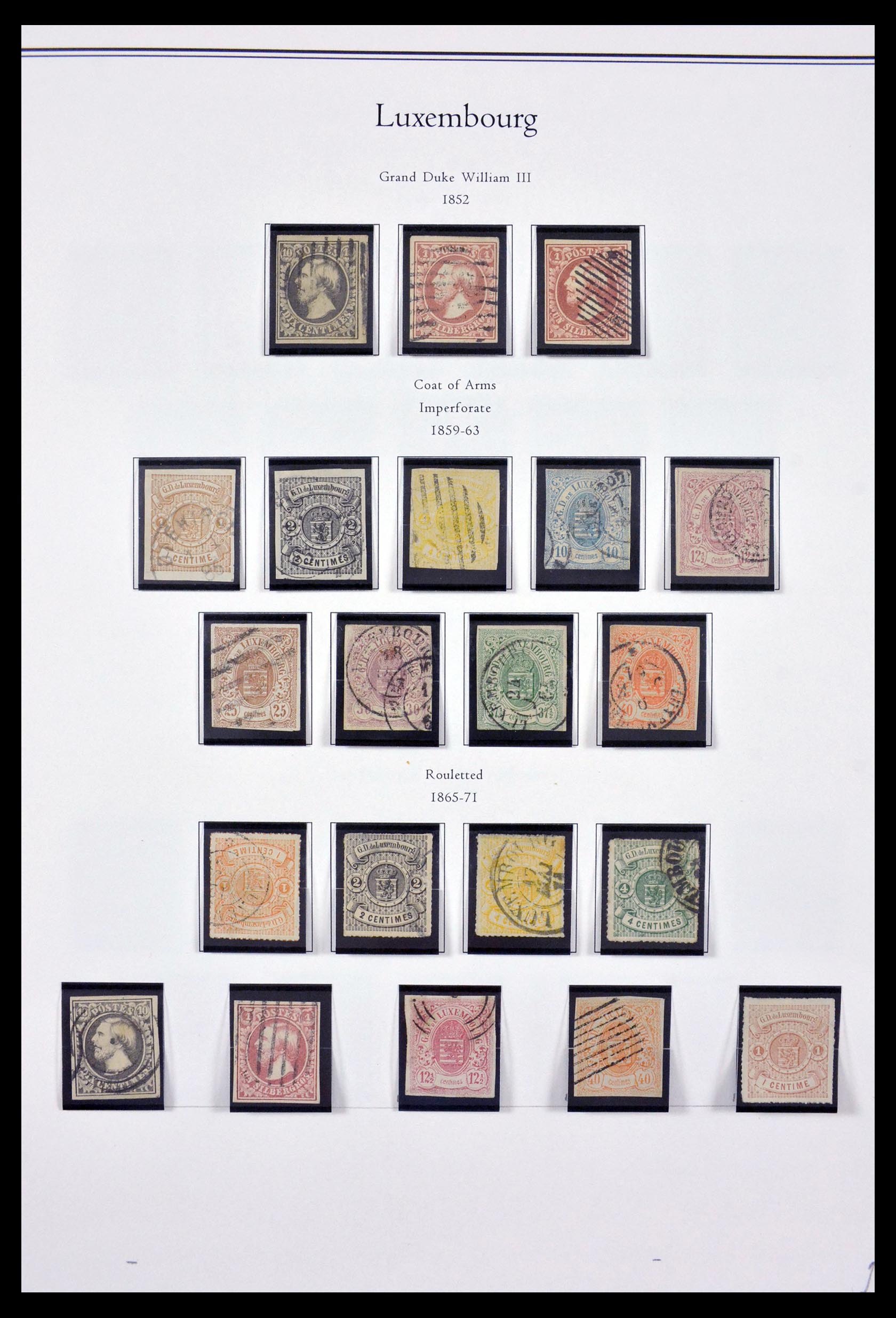 In de hoofdnummers vrijwel complete, gebruikte (in moderne deel postfrisse) collectie Luxemburg 1852-2008 in 2 Amerikaanse Palo albums met cassettes. Collectie bevat o.a. (Michel no’s): 1-2, 3-11, 12-15, 16-23, 24-25, 27-36 (zonder 34), 56, 66, 72-83, 182-186, 208-212, 213-217, 227-231, 240-244, 245-249, 252-256, 259-264, 266-273 (intellectuelen tot 3 Frank), 284-289, blok 3*, 3, 5, 6, 7, etc. Ook goed deel dienstzegels aanwezig. Mooie collectie, hoge cat. waarde!