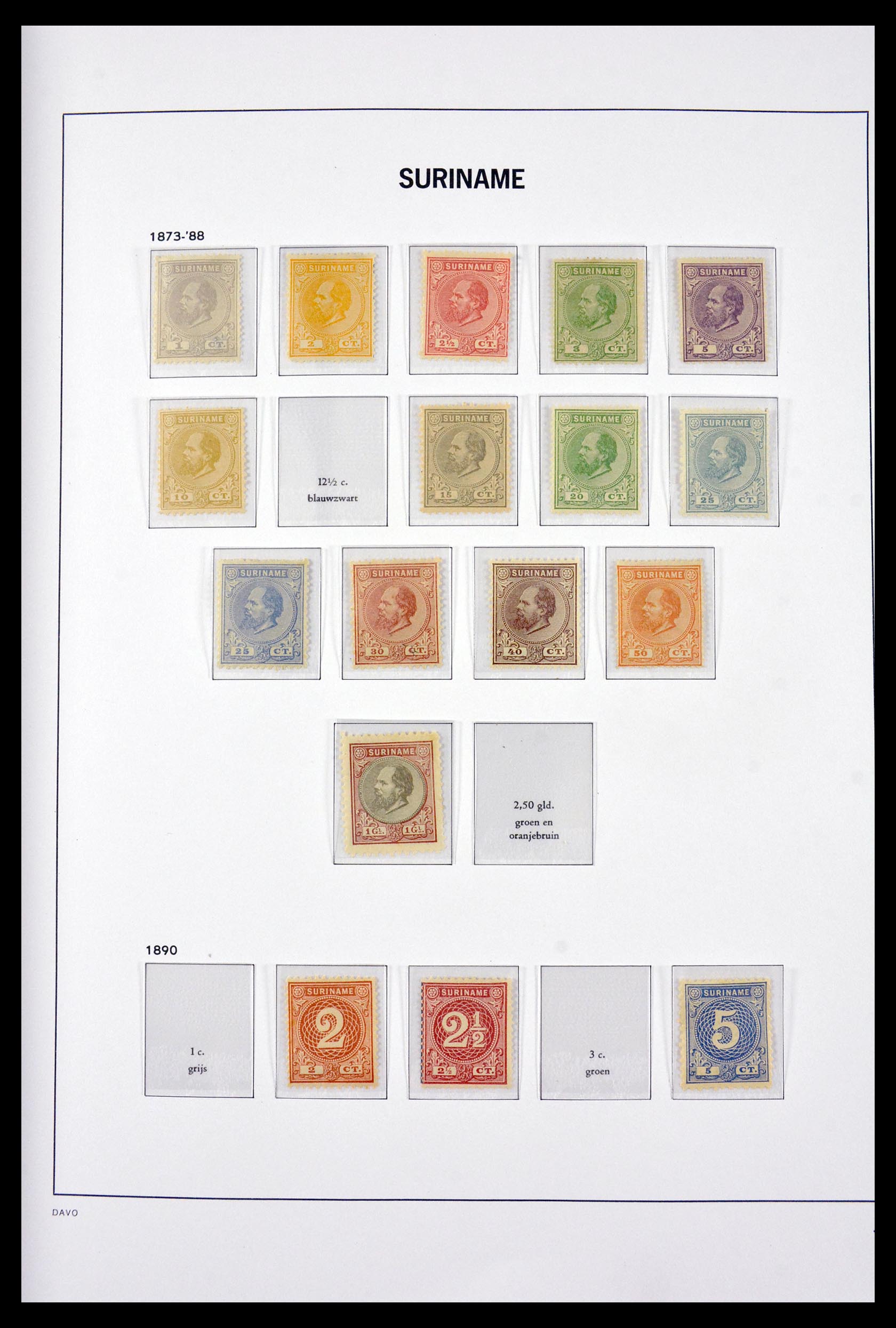 Goed gevulde, postfrisse en ongebruikte collectie Suriname 1873-1975 in Davo luxe album, waarin o.a. (NVPH no’s): 1-15(*) (zonder no. 7 en 15, maar inclusief 10a), 56-57(*), 64(*), 104-110*, 119*, 229-238**, 239-243**, luchtpost 15-19*port 3, 15-16(*), 36-46* etc.