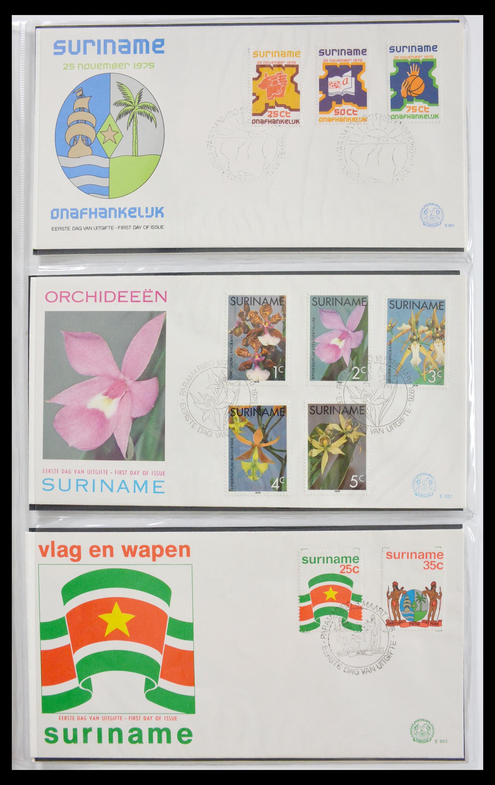 Vrijwel complete collectie onbeschreven FDC’s Republiek Suriname 1975-2011 in 5 FDC albums. Cat. waarde ca. 6000 euro!