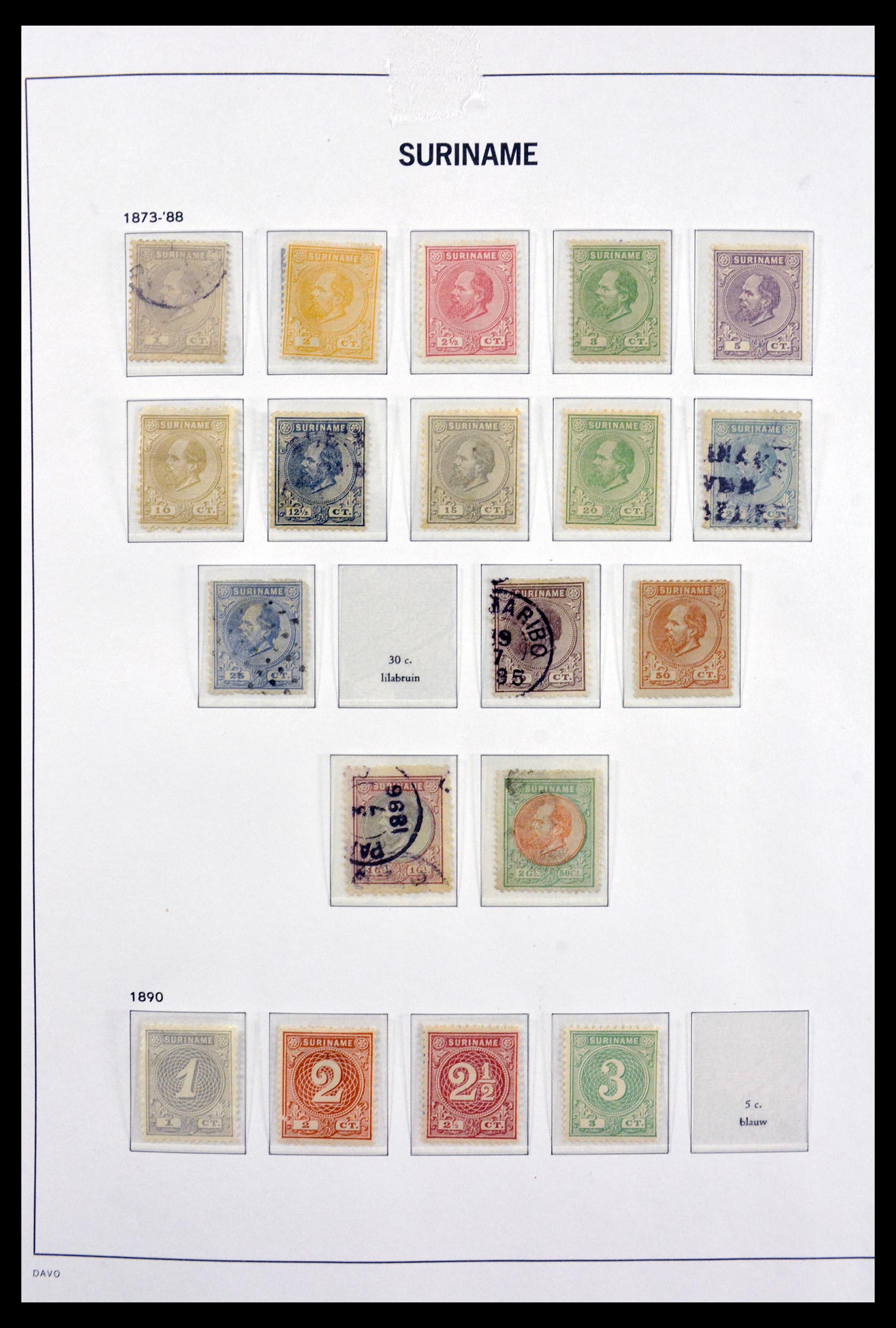 Aardig gevulde, postfrisse, ongebruikte en gebruikte collectie Suriname 1873-1975 in Davo luxe album, waarin o.a. (NVPH no’s): 14, 15, 34, 35(*), 36(*), 87-99*, 130-136*, 137-140*, 141-144*, 146-149*, 151-156*, 280-283*, 285-294*, 297-307**, 308**, 309-311**, 312-315**, luchtpost 1-7**, port 9-14(*) (no. 14 gestempeld), 17-32*, 33-35**, etc.