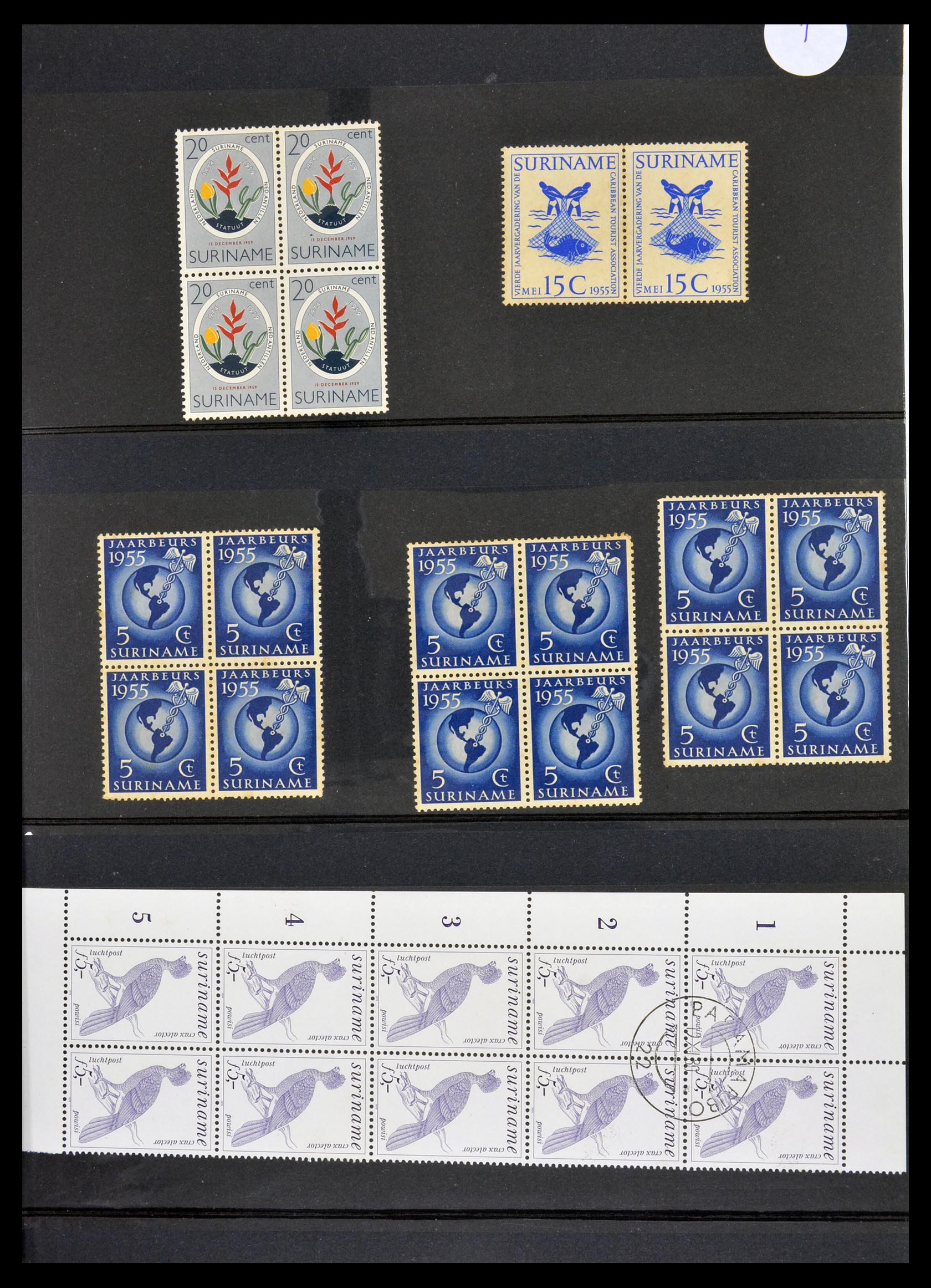 Insteekboek met ongebruikte en gebruikte blokken van 4 van Suriname 1913-1982, waaronder veel betere zegels, maar vrijwel alle getint. Zeer hoge catalogus waarde!
