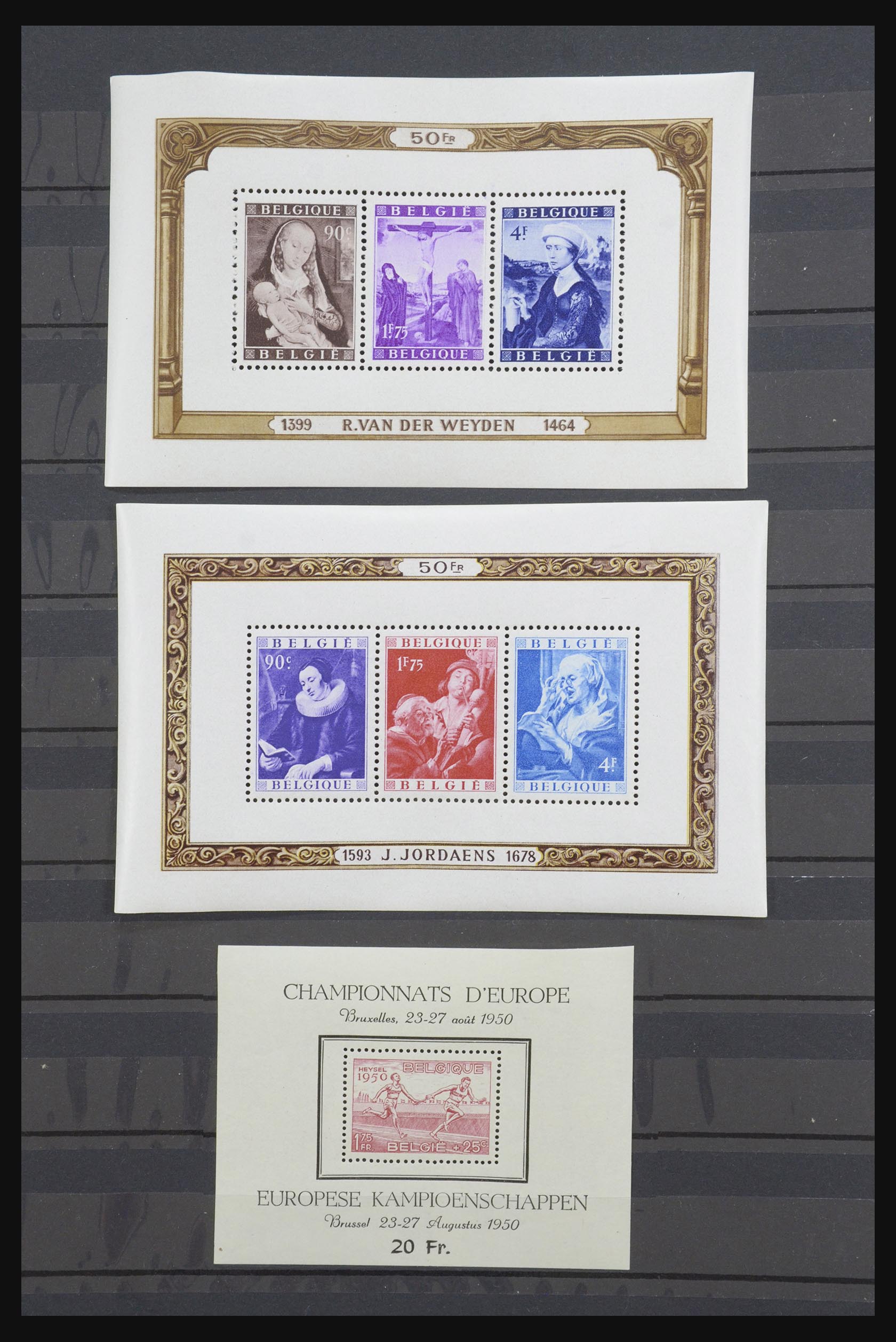 Stockblad met 6 postfrisse blokken van België: Michel blok 21 (van der Weyden), 22 (Jordaens), 23 (atletiek), 24 (Koekelberg met vouw), 25 (Zuidpool expeditie) en 26 (vluchtelingenjaar). Cataloguswaarde 885 euro.