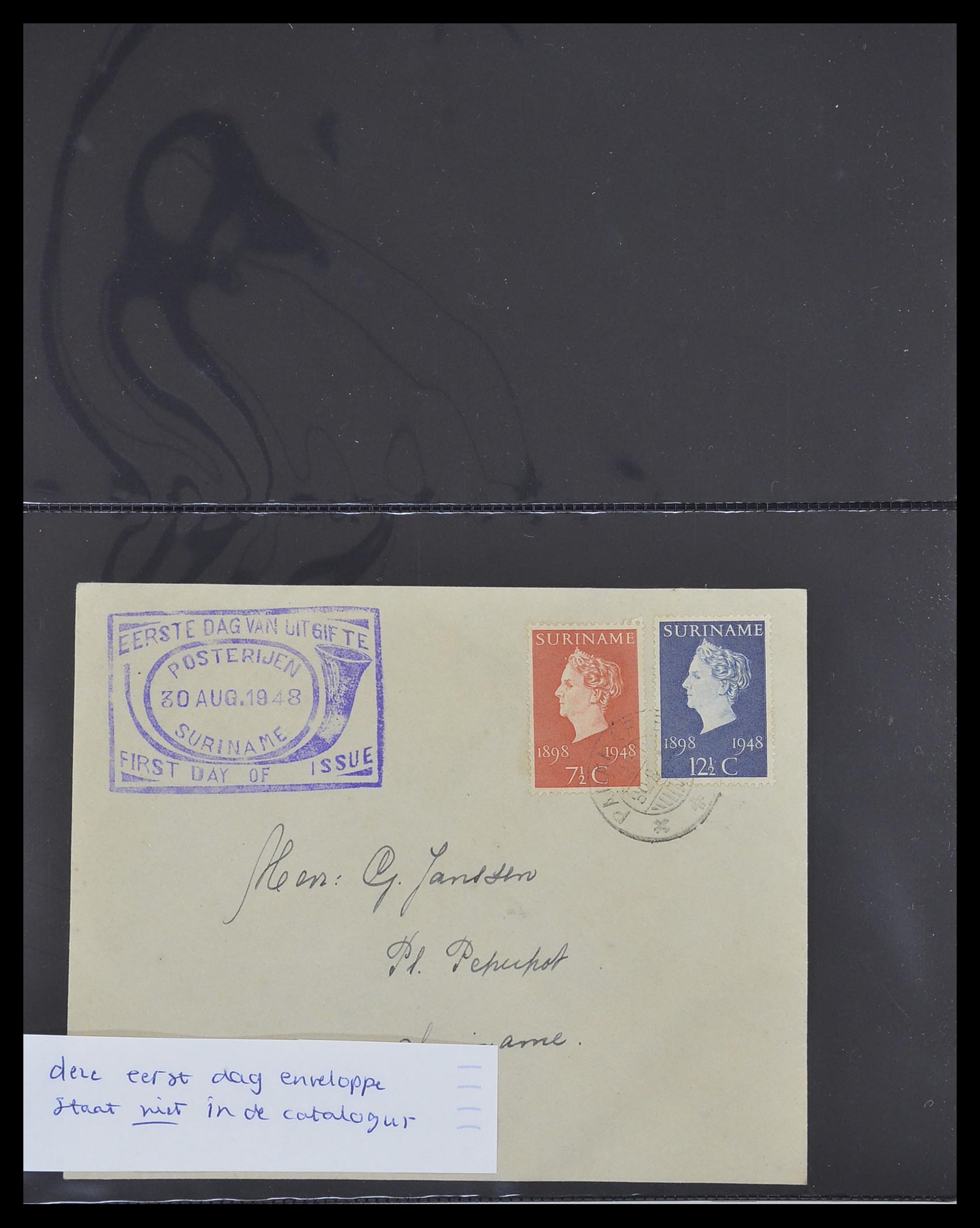 Map met 5 oude FDC’s van Suriname 1948-1950, mooie kwaliteit.