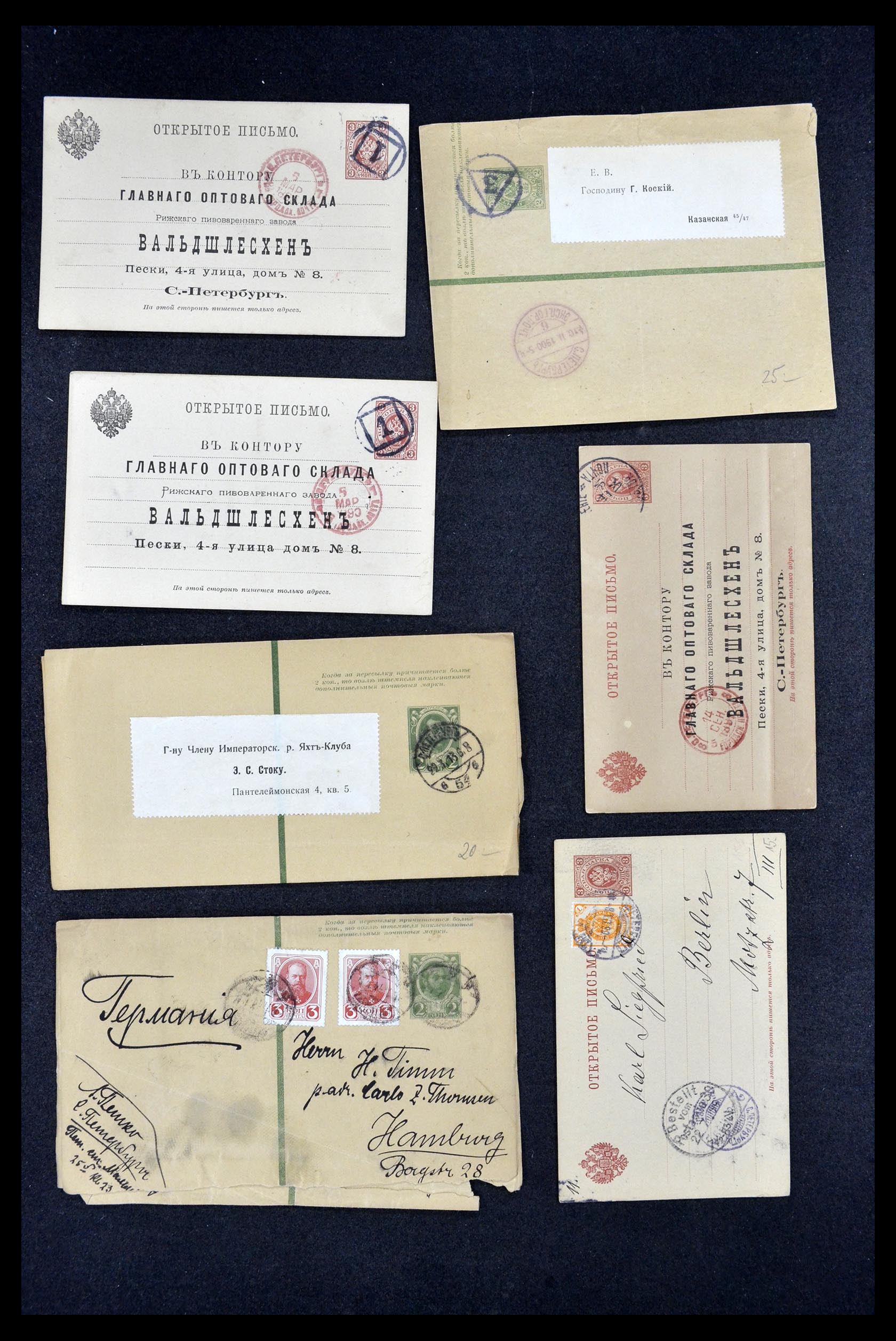 Doosje met 134 oude kaarten van Rusland 1882-1913, voornamelijk met nummerstempels van St. Petersburg.