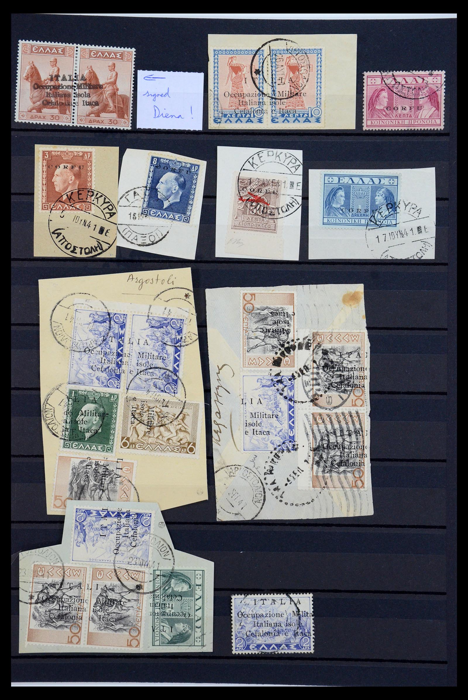 Stockblad met diverse zegels van de Italiaanse bezetting van Griekenland, waaronder Sassone Cefalonia e Itaca 72* (gekeurd Diena). Tevens 2 aardige postwaardestukken aanwezig.