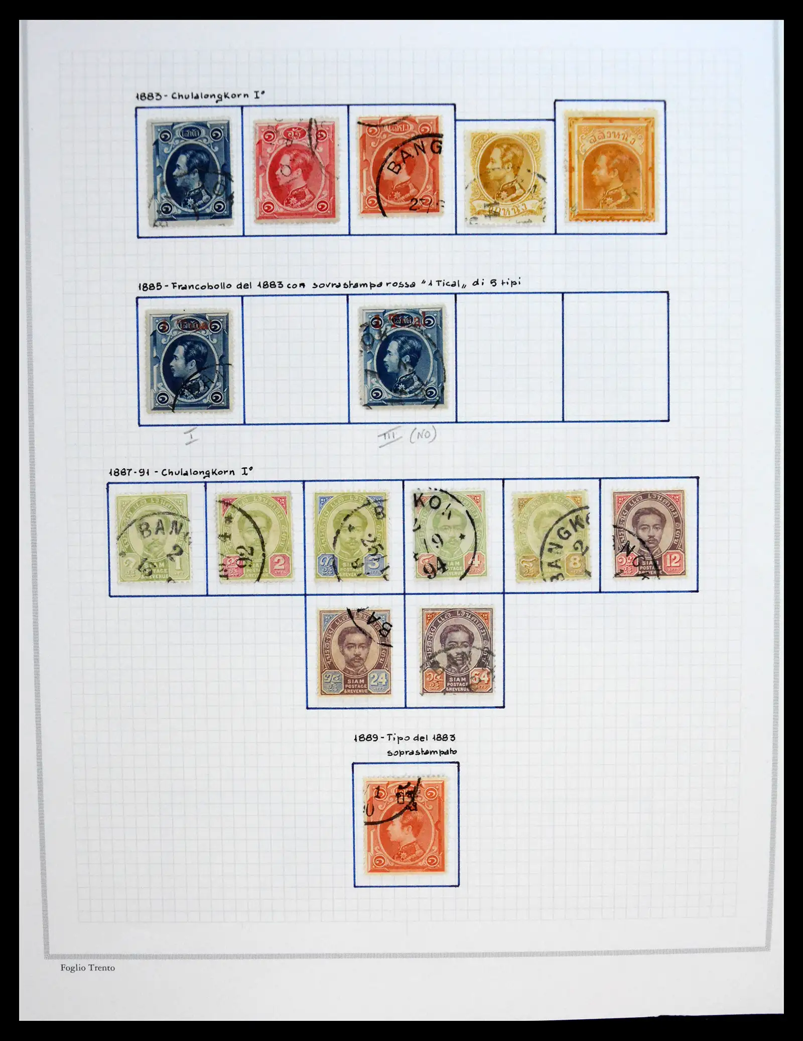 Zeer goedgevulde gebruikte/ongebruikte/postfrisse collectie met heel veel beter klassiek materiaal, 1e serie, 2x 1885 tical opdruk, latere opdrukken deels gespecialiseerd, met typen, 1908 opdrukken, 1908 hoge waarden t/m 40 ticals, 1912 en 1917 t/m 20 baht, rode kruisopdrukken inclusief 1918: 20 baht gebruikt, moderner deel met veel blokken, opgezet in 6 Italiaanse Marini albums.