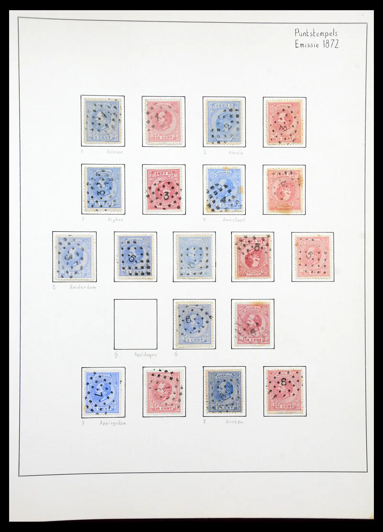 Mooie verzameling stempels op emissie 1872, enkele op brief, waaronder puntstempels, franco stempels, haltestempels en penvernietigingen in album. Leuke verzameling om voor te zetten.