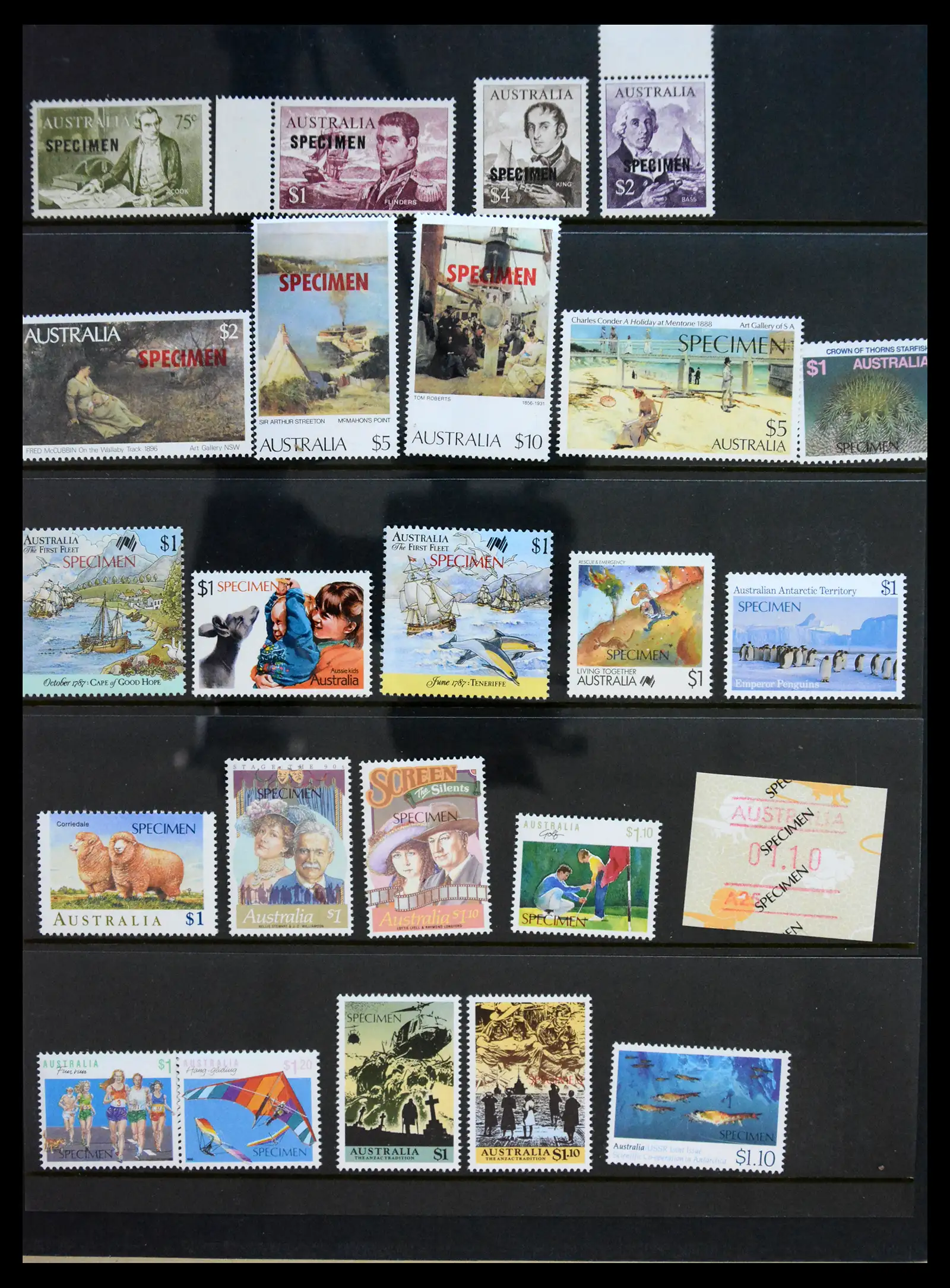 Verzameling van 85 postfrisse zegels met specimen opdruk waaronder schaars materiaal, hoge waarden en blokken van 4 op insteekbladen in map. Zelden aangeboden.