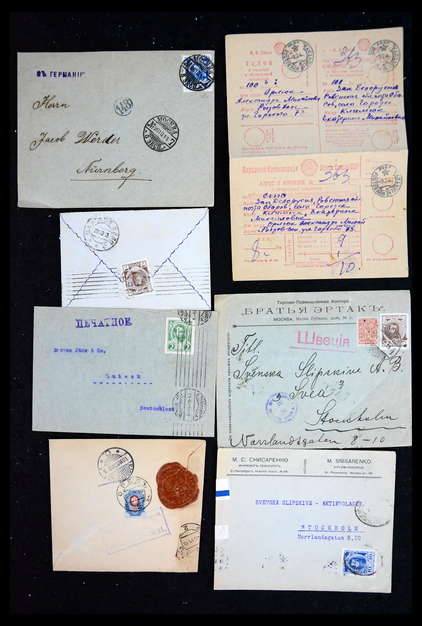 Collectie oude brieven en kaarten, waaronder betere frankeringen, bestemmingen, stempels, etc., in doosje.